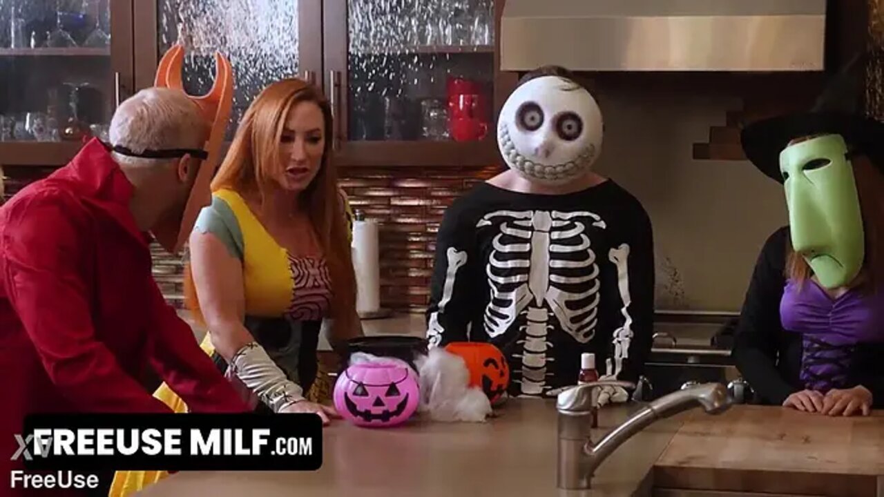 Two gorgeous mature MILFs, Evie Christian and Sophia Locke, attend a Halloween party dressed in sexy costumes. They cheat on their husbands with Anthony Pierce and Tony Sting, getting deepthroat blowjobs and pussy licked. They end up on their knees in doggystyle as the men pound them intense, leaving them covered in cum.